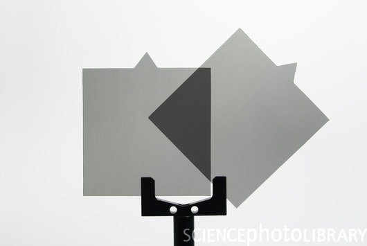 我們一手拿著一片偏光鏡,一前一後的放在眼前,然後轉動其中一片。這樣一來我們知道能夠通過兩片偏光鏡的光一定具備同樣的偏振方向… 但接下來我問他們,如果只有一片偏光鏡時,我們怎樣分辨出偏振方向呢?他們茫然一片。
