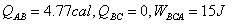 例題: 一氣缸中的氣體進行圖中的循環,求在CA的過程中,系統得到的熱量是多少? 答: