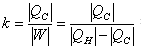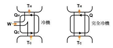 冷機: 將熱能由冷的地方轉移到熱的地方的裝置。 當外力對系統作功時,系統將熱能QC由低溫熱庫TC傳送熱能QH到高溫熱庫TH 。 效能係數: