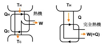 熱機: 在一個循環過程中,將熱轉為功的裝置。 高溫熱庫TH提供QH的熱量,一部份的熱量對外作功,另一部份QC則排至低溫熱庫TC。 熱效率: