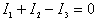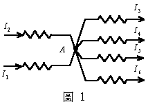 電流定律: 從電路中任可一個接點來看,流入接點電流總量等於流出電流總量。如果約定流入接點的電流方向為正,流出為負,則可說通向接點各電路的電流總和為零,即 |