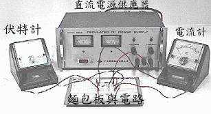 直流電源供應器2台,直流電流計(0~50mA)與直流伏特計(0~10V)各一台,麵包板,精密電阻數枚。
