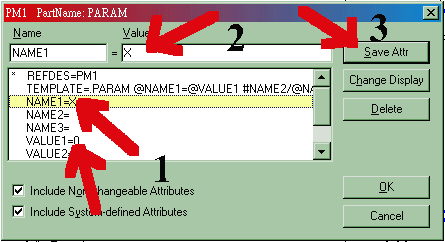 點選[NAME1],在Value處鍵入你要設定參數之名稱。點選[VALUE1]鍵入初始設定值(一定要設!!),[Save Attr]後回到電路圖,可以看到上面有