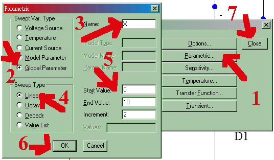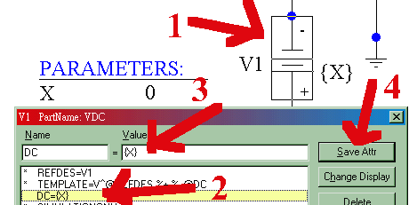 許多元件的參數可用Global Parameter來設定,設定的方法很簡單,在你點選某元件,要改變其參數時,鍵入{X}(大括弧中間夾著參數名)即可。例如你要將一直流電壓源之電壓用參數{X}取代,在點選電壓源後,一下圖示步驟在DC值鍵入{X}即可。